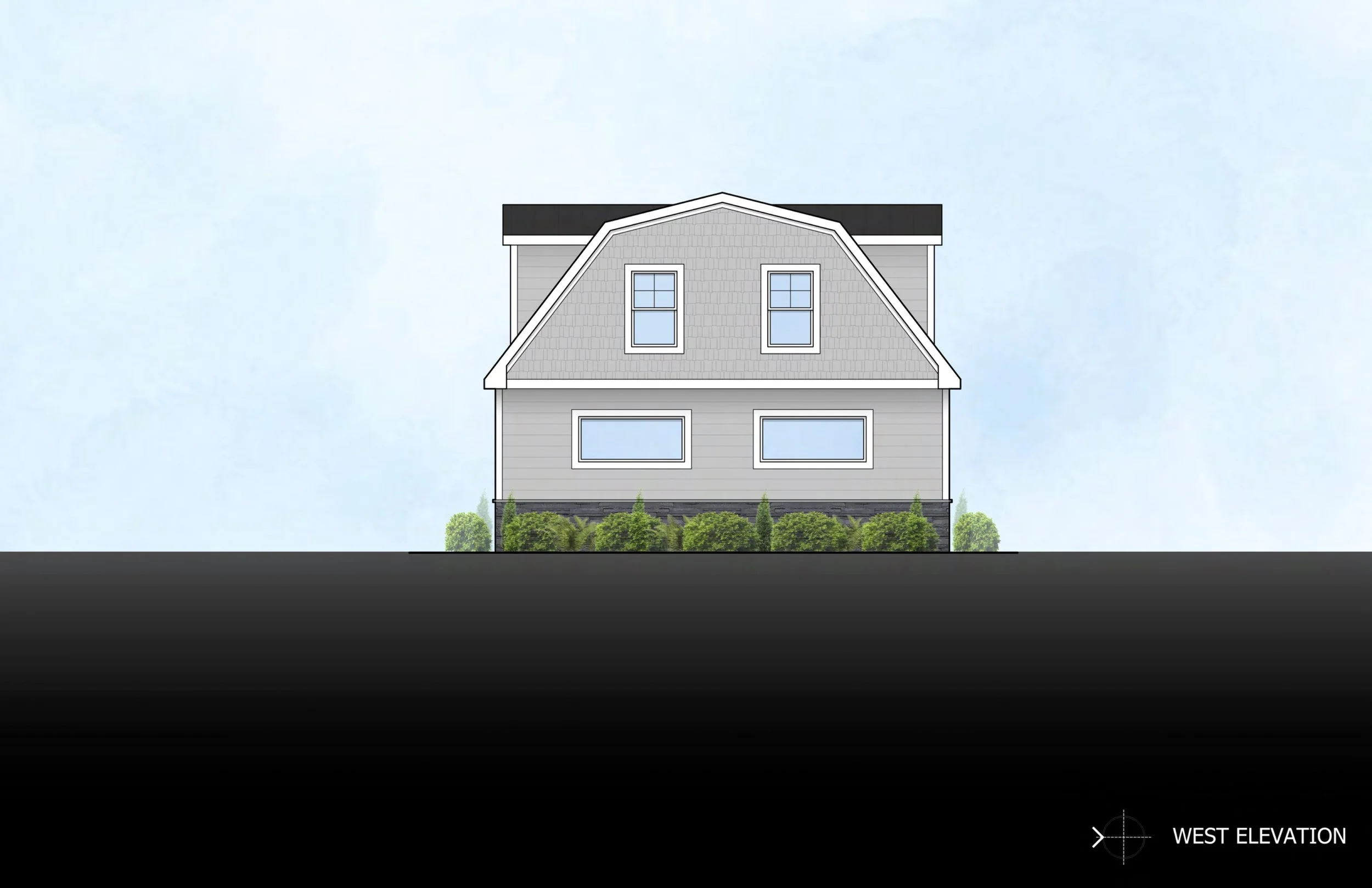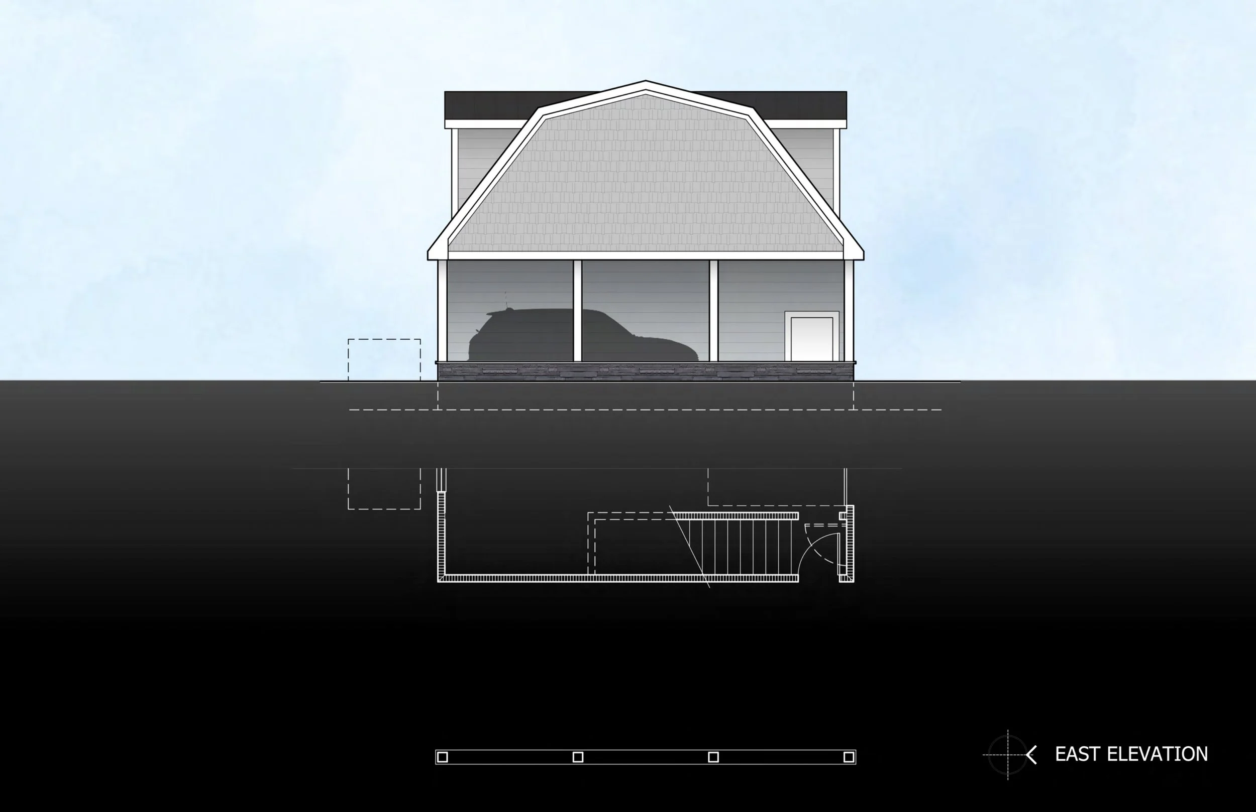 This garage and apartment design takes inspiration from the surrounding rural architecture, using a gambrel roof and simple attic truss framing to create a functional apartment space above a high-ceiling garage. With a full bathroom, shop-ready space below, and an attached carport for covered parking, the design offers a practical model for additional dwelling units (ADUs) as housing needs evolve and zoning codes adapt.